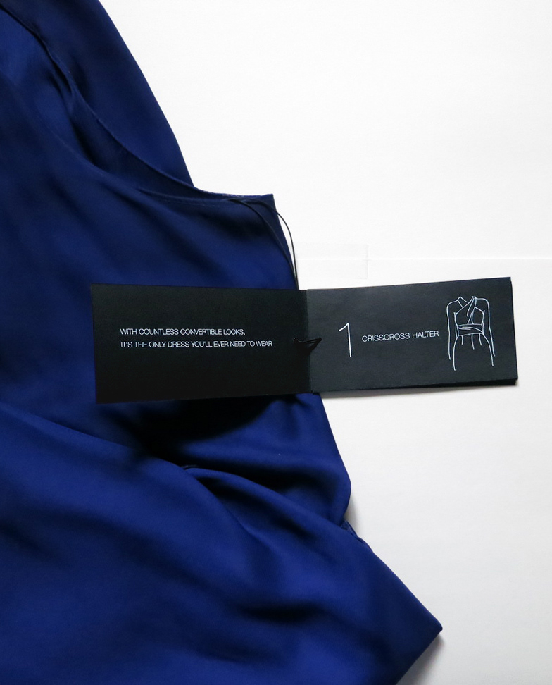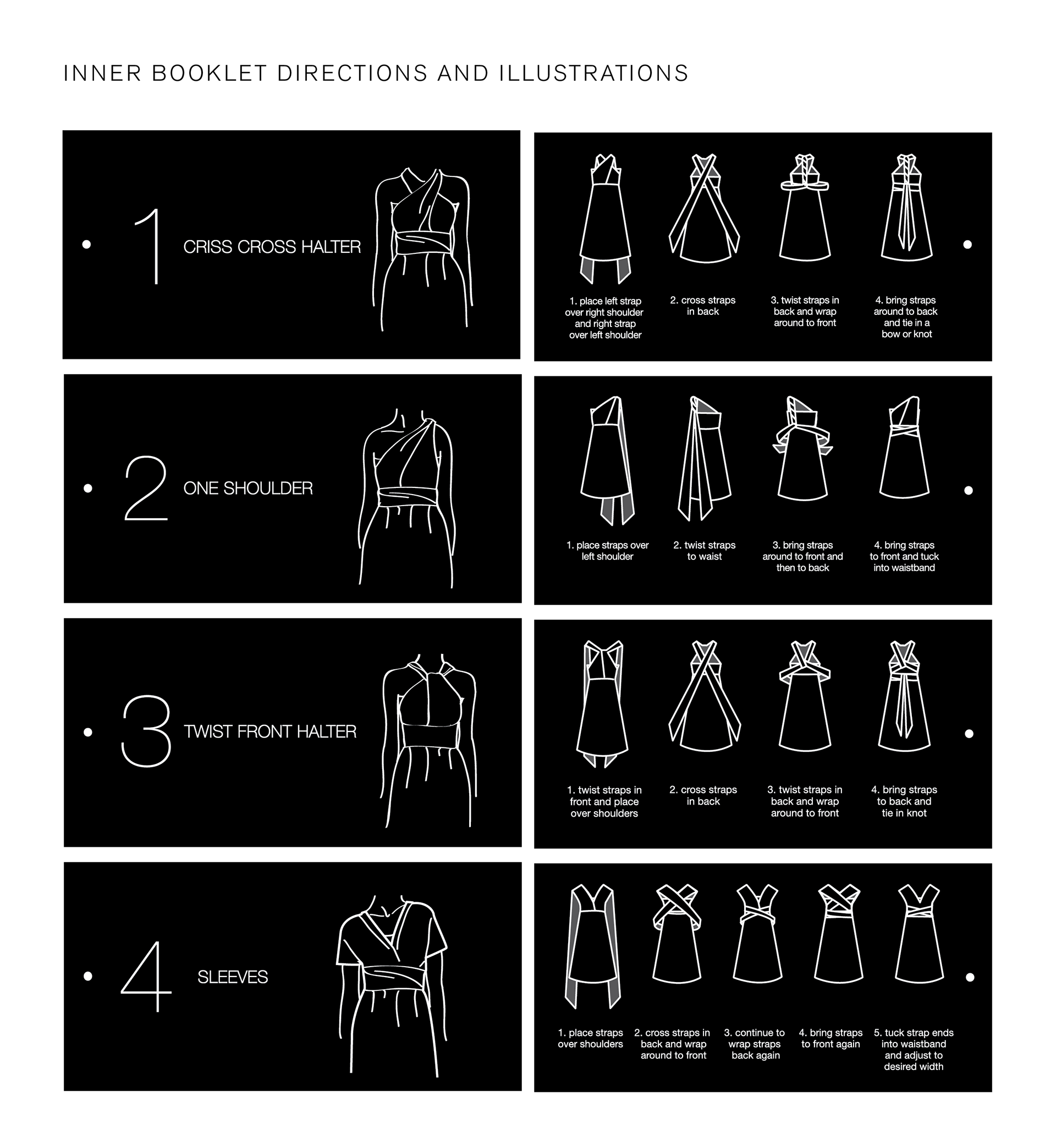 The INC Infinity dress can be worn in a multitude of styles. I designed and Illustrated this hang tag booklet using the four basic styles that the customer can easily wear and make their own.