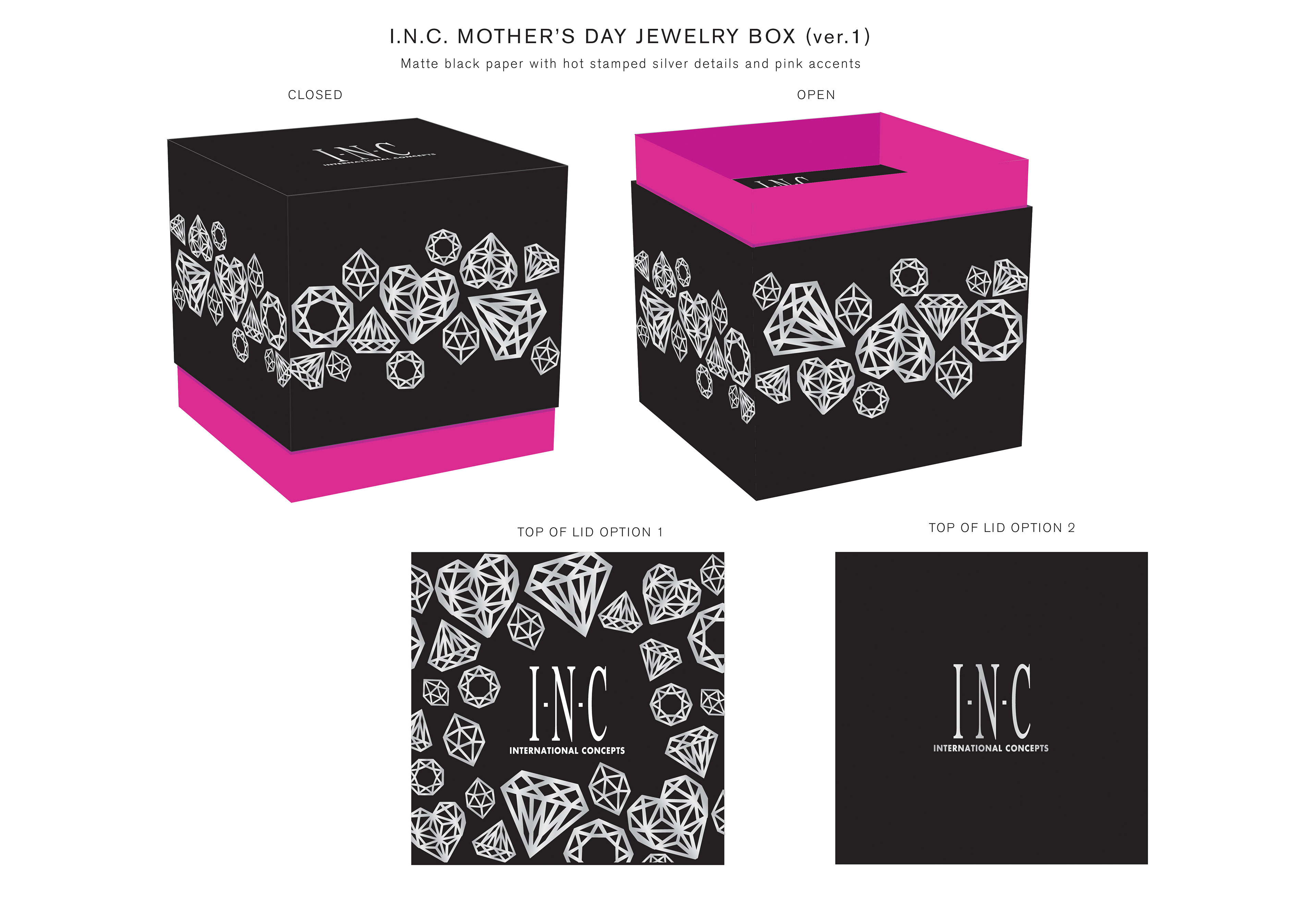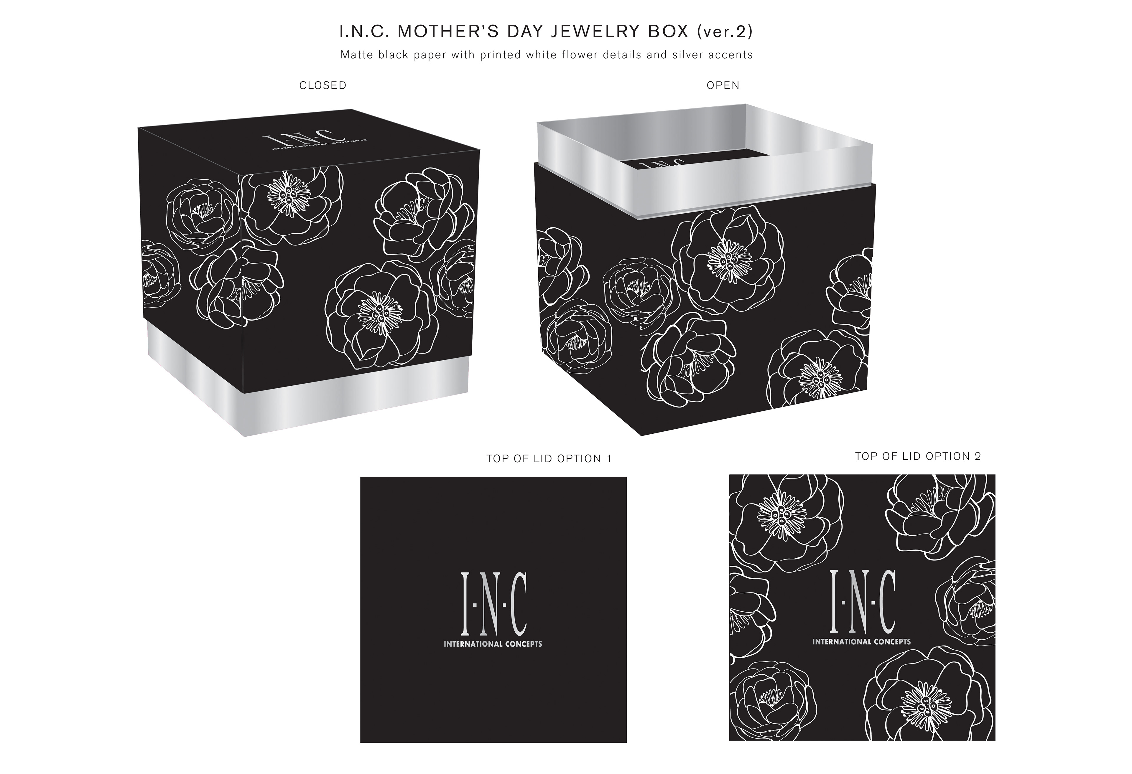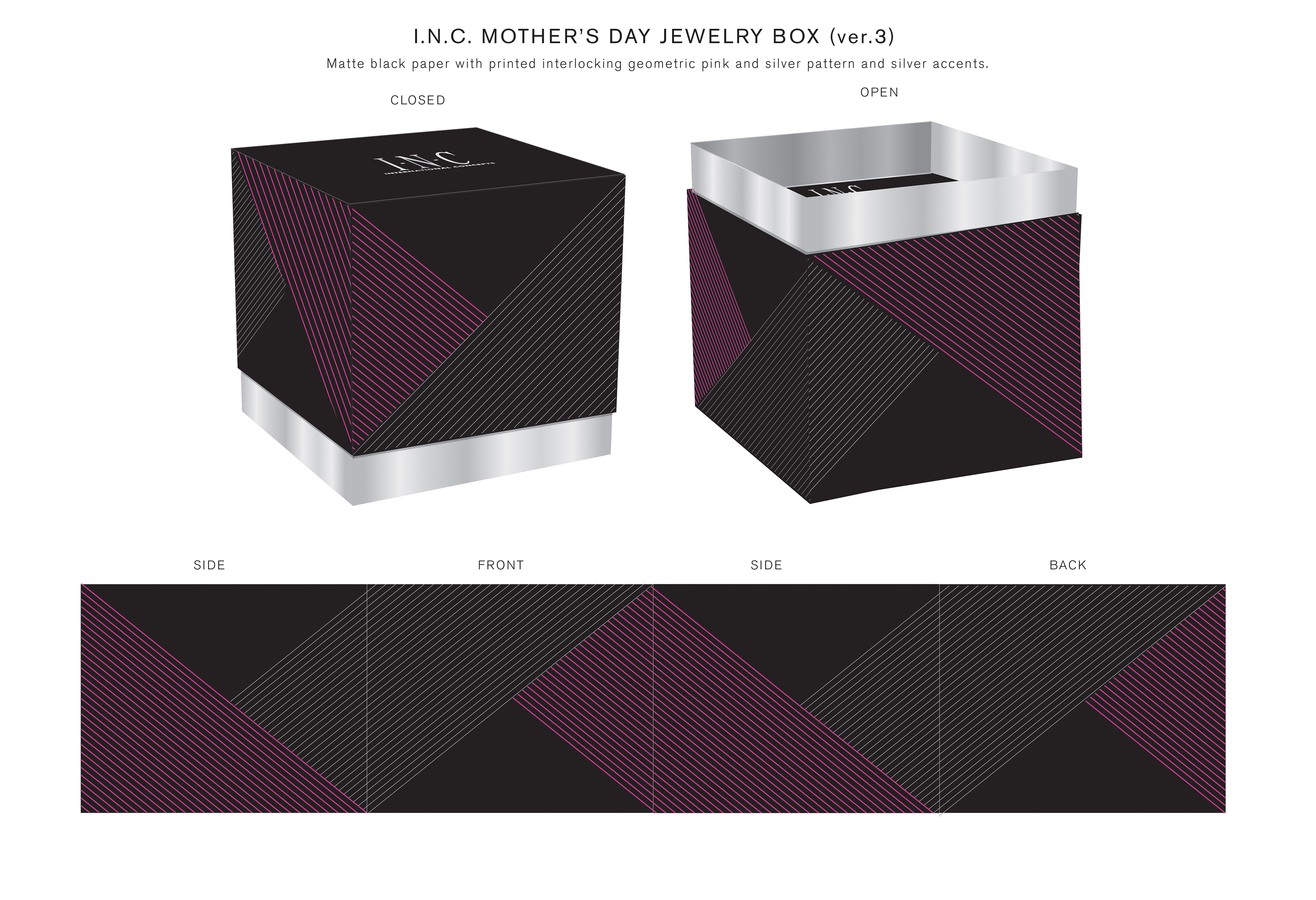 Three variations of a Mother's day bracelet box I was asked to design for Macy's I.N.C. private label.